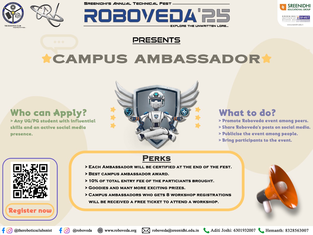 Roboveda, organised by The Robotics Club - SNIST, stands as one of the most anticipated technical festivals in the entire nation. We’ve always been proud to elevate the institution’s name through excellence, and we’re committed to pushing that standard even higher. This technical fest is a vibrant stage where the country’s brightest tech minds come together to challenge themselves in every event. Whether you leave with a trophy or simply with new insights, Roboveda never fails to ignite a deep passion in your heart for learning and achieving more. We, at Team Roboveda, are truly thrilled to have you join us and are looking forward to another incredibly successful chapter together.